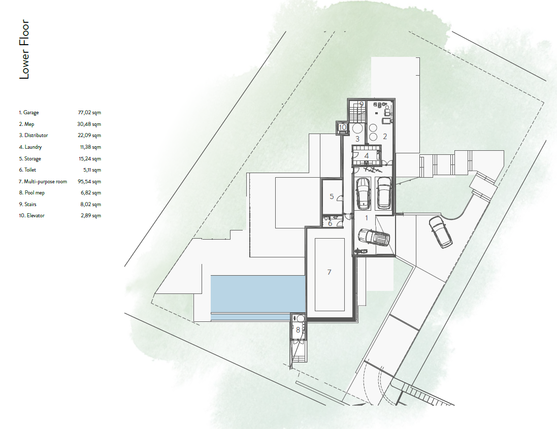 On the upper floor, three en-suite bedrooms each enjoy a private terrace and spectacular views, ensuring both intimacy and immersion in the Mediterranean landscape. The lower level houses a garage, laundry, and a multi-purpose room designed to accommodate a gym or other leisure facilities, perfectly complementing the lifestyle envisioned for this residence. An elevator connects all three floors, enhancing comfort and accessibility.