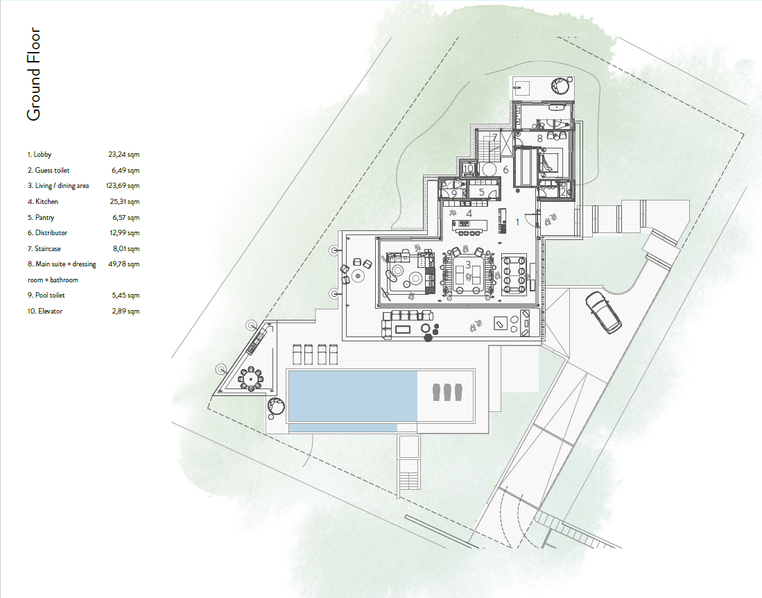 The villa extends across three levels, thoughtfully distributed to ensure comfort, privacy, and a constant connection with the surroundings. The main living space opens entirely to the horizon, with a vast lounge, dining area, and a state-of-the-art kitchen designed with premium cabinetry by brands such as Bulthaup or Valcucine. This fluid open-plan layout connects effortlessly to the panoramic terraces, infinity pool, and an outdoor lounge featuring a barbecue and dining area, all set against the backdrop of the sea. The master suite, located on the same level, offers direct access to the gardens and a private outdoor shower, creating a personal retreat where luxury meets nature.