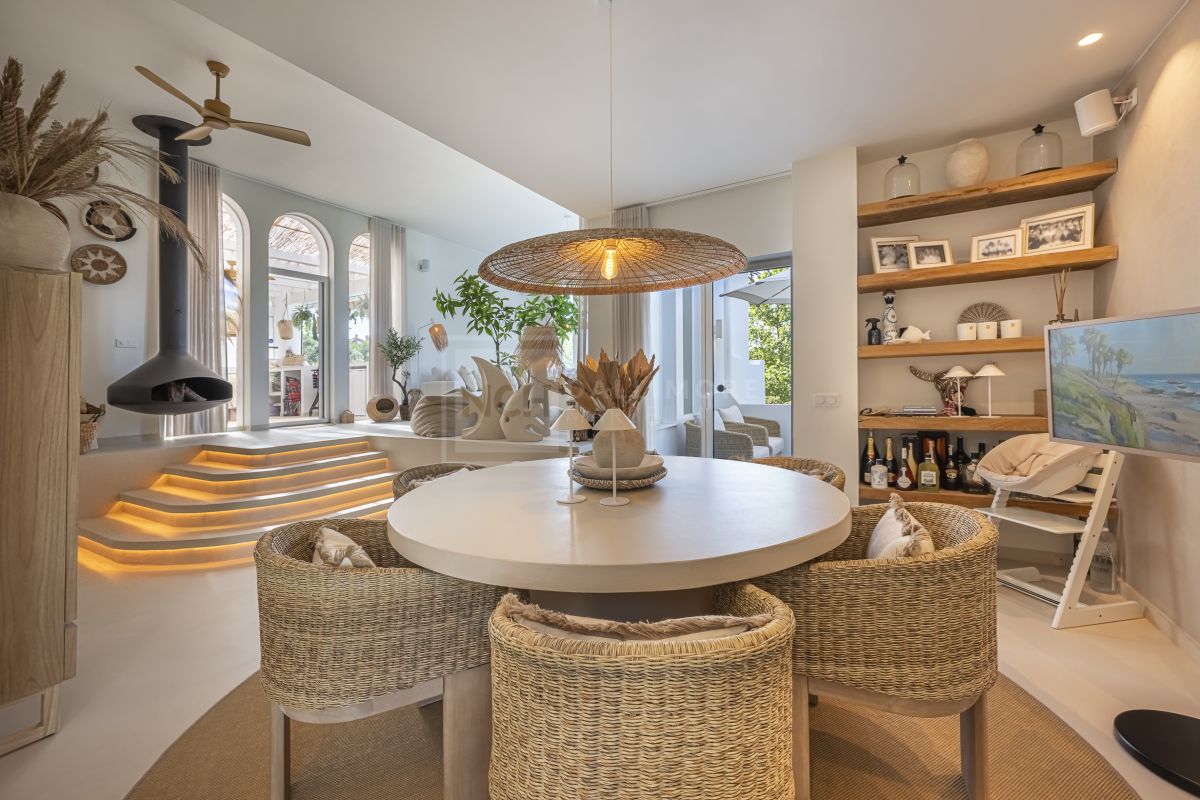 Inside, the design is contemporary and modern, reflecting its recent renovation. A modern boho-chic aesthetic defines the interiors, with light tones and natural textures creating an open, airy atmosphere.